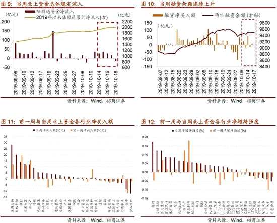本周(10月14日~10月18日)北上資金凈流入96億元,其中當周前四個交易日凈流入109億元,最后一個交易日凈流出13億元。行業(yè)偏好上,北上資金凈買入規(guī)模較高的行業(yè)為醫(yī)藥生物(28.4億元)、非銀金融(20億元)、銀行(14.2億元),其中,醫(yī)藥生物和銀行業(yè)連續(xù)多周凈買入額居前。凈買入額較高的個股主要包括中國平安(16億元)、美的集團(12.8億元)、萬科A(6.6億元)等。凈賣出規(guī)模較高的行業(yè)為食品飲料(-12.2億元)和電子(-8.8億元)。個股凈賣出規(guī)模較高的為貴州茅臺(-13.8億元)、隆基股份(-5.33億元)、【上海機場(600009)、股吧】(-5.26億元)。從增持強度來看,交通運輸在最近一周增持強度明顯擴大,醫(yī)藥生物是連續(xù)四周凈增持強度都靠前的行業(yè),傳媒的增持強度在最近一周出現(xiàn)較明顯轉(zhuǎn)向,電子連續(xù)兩周凈減持強度居前。總體來看,北上資金對醫(yī)藥和銀行等連續(xù)凈買入額居前。