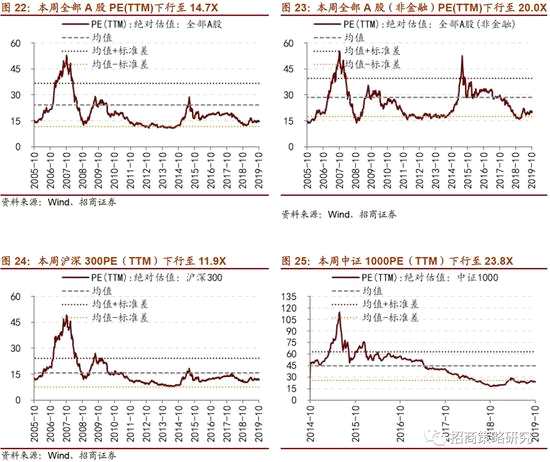 本周市場整體行情走弱,各板塊估值水平均有所下滑。截至10月18日收盤,全部A股PE(TTM)下行至14.7X,處于歷史估值水平的23.8%分位數(shù)。創(chuàng)業(yè)板估值水平變動幅度相對較大,本周下行至41.3X。代表大盤股的滬深300指數(shù)PE(TTM)小幅下行至11.9X,處于歷史估值水平的34.2%分位數(shù)。代表小盤股的中證1000指數(shù)PE(TTM)下行至23.8X,處于2014年以來歷史估值的17.2%分位。