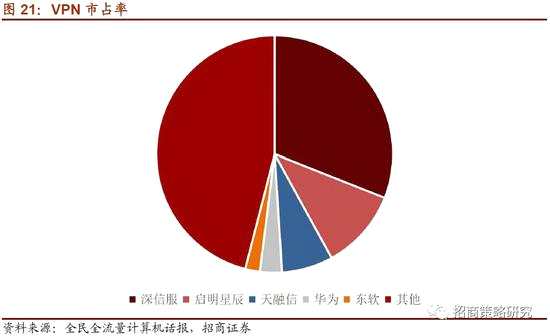 VPN是內(nèi)容審查細分領(lǐng)域產(chǎn)品,屬于信息安全領(lǐng)域。VPN實際上是一種加密形式的數(shù)據(jù)安全通道,即使從外網(wǎng)傳輸?shù)絻?nèi)網(wǎng),通過VPN傳輸,也不會受到任何威脅,從而實現(xiàn)安全訪問。就市場成熟度來說,VPN是比較成熟的產(chǎn)品了,國內(nèi)外廠家都有涉及,其中2018年市場規(guī)模為1.69億美元,市場份額方面,深信服、啟明星辰以及天融信占據(jù)前三甲,分別占據(jù)31%、11%以及7%的市場份額。