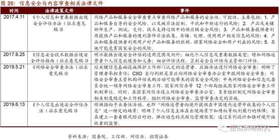 我們在9月17日發(fā)布的科技周報中《5G+政策催化網(wǎng)絡(luò)安全投資機會》中重點提示:5G時代,云計算、物聯(lián)網(wǎng)、大數(shù)據(jù)以及移動互聯(lián)等新興技術(shù)的普及已經(jīng)催生了更多的新興安全領(lǐng)域,網(wǎng)絡(luò)安全從被動防御變成了主動防護,加上最近一年等保2.0、密碼法草案等法律政策支持,網(wǎng)絡(luò)安全行業(yè)發(fā)展將進入快車道。近幾年在網(wǎng)絡(luò)內(nèi)容審查領(lǐng)域,國家頻頻頒布重磅政策及文件,規(guī)范行業(yè)發(fā)展,行業(yè)集中度有望進一步上升,龍頭企業(yè)市場份額不斷增加,我們認為網(wǎng)絡(luò)內(nèi)容審查領(lǐng)域?qū)⒂瓉睃S金發(fā)展期,建議關(guān)注相關(guān)受益企業(yè)。