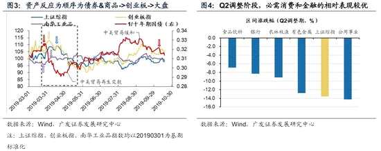 4. 參照4月類(lèi)似情景,大類(lèi)資產(chǎn)下跌的傳導(dǎo)順序沿債券跌&商品漲——>創(chuàng)業(yè)板跌&商品調(diào)整——>A股大盤(pán)調(diào)整。反映先上調(diào)盈利預(yù)期、后下調(diào)政策預(yù)期的過(guò)程。大類(lèi)資產(chǎn)輪動(dòng)經(jīng)驗(yàn)上,3月31日PMI數(shù)據(jù)超預(yù)期、4月12日公布大超預(yù)期的社融數(shù)據(jù),4月17日公布了積極的3月經(jīng)濟(jì)數(shù)據(jù)。最早作出反應(yīng)的是債券和商品,10年期國(guó)債在3月底便開(kāi)始下跌,直到5月6日Trump發(fā)推貿(mào)易再生變數(shù)后重回上行;而南華工業(yè)品指數(shù)則在3月底快速反彈,但在社融數(shù)據(jù)公布后進(jìn)入震蕩調(diào)整,率先反映了本次回暖可持續(xù)性偏弱。在此期間,黃金價(jià)格和人民幣匯率保持平穩(wěn),之后價(jià)格波動(dòng)與貿(mào)易事件驅(qū)動(dòng)相關(guān)度更高。本次債券自9月中旬MLF未下調(diào)利率開(kāi)始下跌,A股的貼現(xiàn)率受到負(fù)面影響。