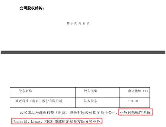 另外,公告還顯示,武漢誠(chéng)邁為上市公司誠(chéng)邁科技(300598.SZ)的全資子公司,業(yè)務(wù)包括操作系統(tǒng) (Android、Linux、RTOS)領(lǐng)域的定制開(kāi)發(fā)服務(wù)等。