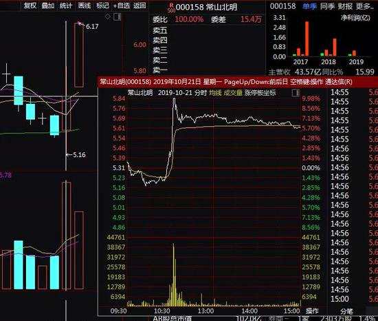 10月21日盤(pán)中,原本平靜的【常山北明(000158)、股吧】股價(jià)突然急速拉升,在極短時(shí)間內(nèi)沖上漲停,截至當(dāng)天收盤(pán),股價(jià)仍大漲5.65%。10月22日,該股繼續(xù)大漲,收盤(pán)強(qiáng)勢(shì)封住漲停,兩天下來(lái),常山北明市值暴增超過(guò)10億元。