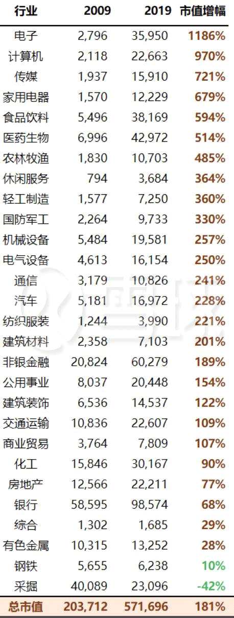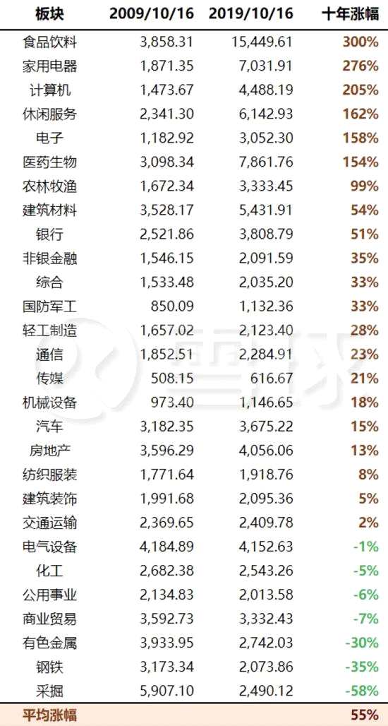 除了全部個股,再從全行業(yè)的角度看看A股十年到底漲沒漲。