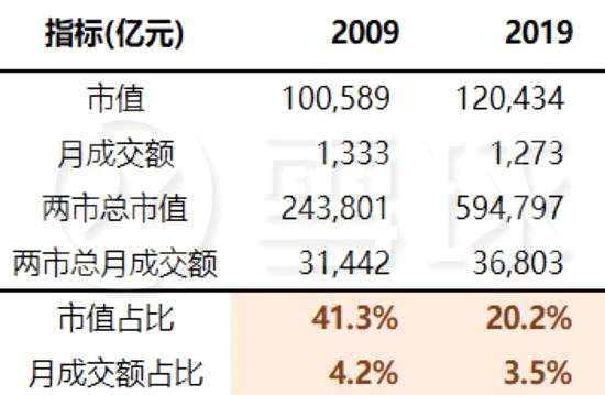 2009年兩市前十大市值的公司市值總和為10.1萬億元,要占到兩市總市值的41.3%,而月成交額占比僅為4.2%。