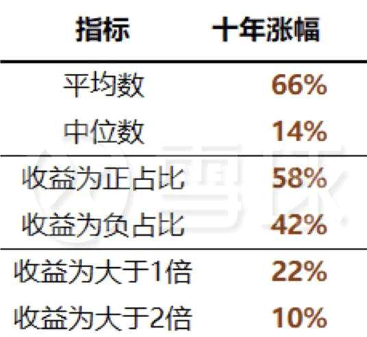 從具體的漲跌幅來說,全部1590只上市滿十年的股票平均漲幅為66%,中位數(shù)漲幅也有14%。而上漲超過一倍和兩倍的則分別有345只和166只股票。