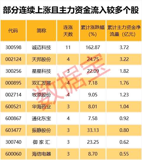 值得注意的是,109只連續(xù)上漲個(gè)股中,6只個(gè)股期間主力資金累計(jì)凈流入超過億元。其中,累計(jì)資金流入最多的為誠邁科技,主力資金累計(jì)流入3.72億元。