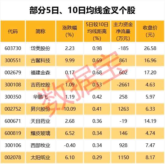 截至10月22日收盤,有22只A股的5日均線主動(dòng)上穿10日均線,其中岱美股份、古鰲科技、福建金森(維權(quán))等個(gè)股的5日均線較10日均線距離最大,分別達(dá)0.98%、0.69%、0.68%。值得注意的是,云天化、昆藥集團(tuán)、東華軟件等個(gè)股主力資金凈流入居前。