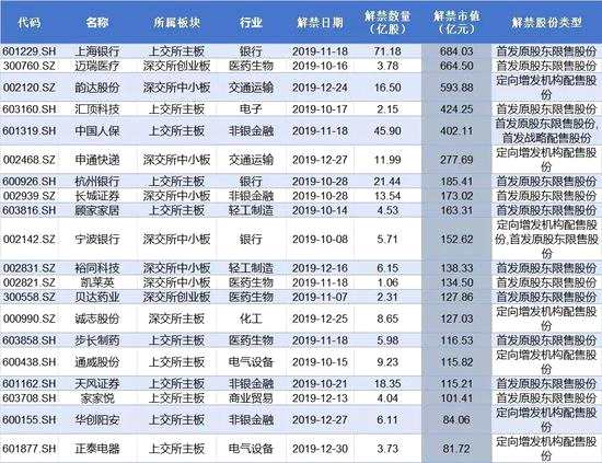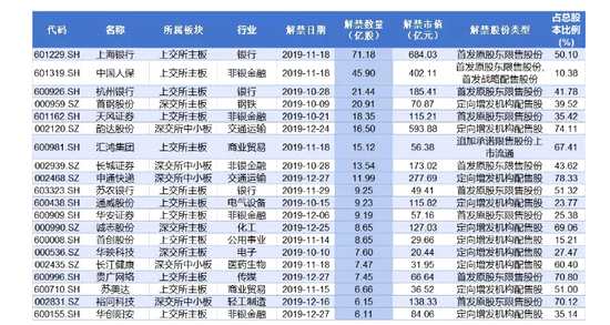 今年四季度A股公司解禁市值前20名