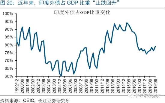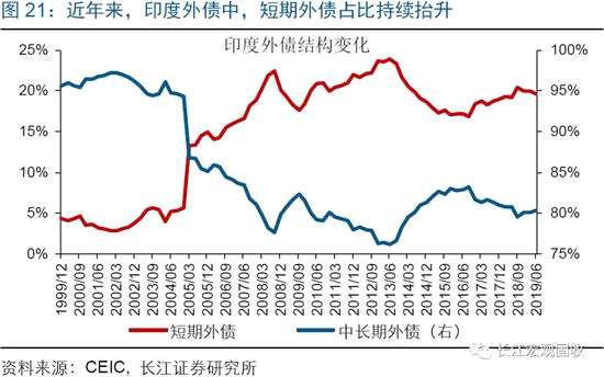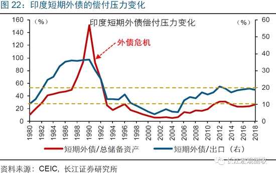 伴隨著經(jīng)濟進一步走弱,印度因本幣貶值、資本外流等,面臨的外債償付壓力將加速抬升。上世紀90年代前后,印度曾因無法償付到期的短期外債,爆發(fā)外債危機。本輪周期,印度為了促進國內(nèi)經(jīng)濟發(fā)展,再次對外大肆舉債。目前,印度外債占GDP比重已達80%左右;外債結(jié)構(gòu)中,短期外債[注釋3] 、中長期外債占比分別為20%、80%。根據(jù)最新數(shù)據(jù)測算,印度短期外債與總儲備資產(chǎn)、出口的比值已分別達到26%、19%,雙雙升至近27年來的高位。未來一段時間,伴隨著經(jīng)濟走弱、資本外流,印度面臨的外債償付壓力將加速抬升。