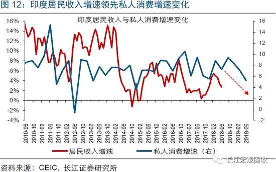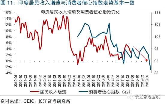 [注釋1] 2018年5月后,印度不再公布居民收入的月度數(shù)據(jù)。考慮到印度消費者信心指數(shù)與居民收入增速走勢基本一致,我們使用它作為收入的替代指標。