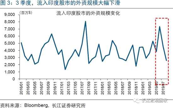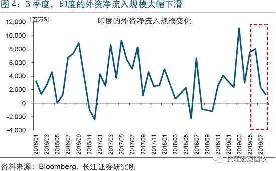 印度金融市場出現(xiàn)劇烈調(diào)整,或與外資的大幅撤離緊密相關(guān)。由于增長潛力較大,疊加政府出臺各類有利外資流入的政策,印度一直受到外資的青睞。根據(jù)彭博的統(tǒng)計,過去4年間,印度的外資凈流入規(guī)模超過2000億美元,在所有新興經(jīng)濟體中位居前列。外資的大幅流入,不僅促進了印度經(jīng)濟的發(fā)展,也推升了各類金融資產(chǎn)的價格。但今年7月以來,伴隨印度金融市場劇烈調(diào)整的是,外資的大幅撤離。數(shù)據(jù)顯示,3季度,印度單月凈流入的外資規(guī)模從80億美元以上大幅下滑至不足13億美元。