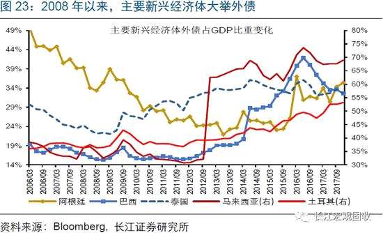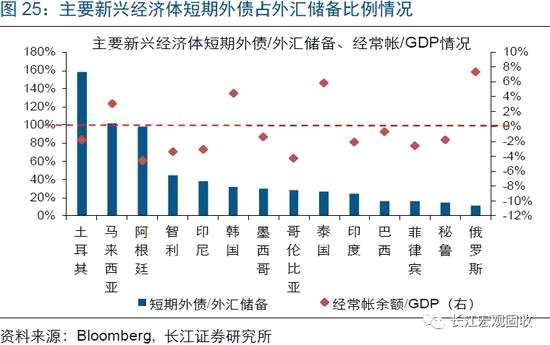 不僅僅是印度,新興市場普遍存在下行壓力,部分經(jīng)濟體甚至可能暴露尾部風(fēng)險。印度經(jīng)濟的下行,并非特例。歷輪全球經(jīng)濟回落過程中,新興市場普遍存在下行壓力,并曾多次爆發(fā)危機。本輪周期,隨著全球經(jīng)濟加速下滑,警惕阿根廷、馬來西亞、土耳其等外債償付壓力大(短期外債/外匯儲備比例均接近、甚至超過100%)的新興經(jīng)濟體,爆發(fā)外債危機。與此同時,生產(chǎn)型新興經(jīng)濟體中,開放型經(jīng)濟體將面臨資本外流沖擊;泰國、韓國、印尼、越南等杠桿高企、估值已達歷史高位的市場,面臨的調(diào)整壓力尤其需要留意。(關(guān)于新興市場的詳細分析,請參考報告《長江宏觀·趙偉 | 新興市場“多空之辯”》)