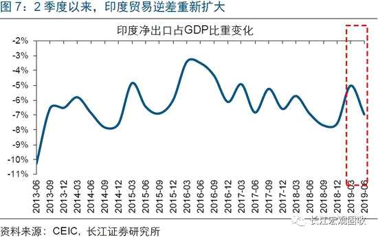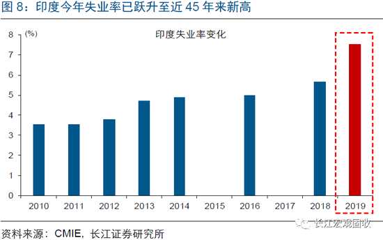 資本“逃離”印度背后,是印度經(jīng)濟基本面的加速惡化。今年2季度,印度GDP同比僅增長5%,不僅連續(xù)第5個季度下滑、遠遠低于市場預(yù)期,更是創(chuàng)下2013年以來最低水平;GDP主要分項中,消費、投資、出口全面回落。與此同時,印度貿(mào)易逆差不再收窄、重新走擴,凈出口占GDP比重下滑至-7%。伴隨經(jīng)濟加速回落,印度失業(yè)率飆升。根據(jù)CMIE的統(tǒng)計,印度今年失業(yè)率已躍升至7.5%、創(chuàng)下近45年來新高。