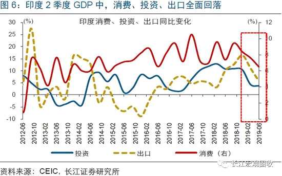 隨著領(lǐng)先指標加速回落,疊加前期財政刺激效應(yīng)衰減,印度消費及投資增速趨持續(xù)下滑。2017年,伴隨印度開始實施GST(新的稅收體系),印度居民、企業(yè)在減稅福利的帶動下,加快消費、投資。但伴隨減稅的刺激效應(yīng)逐步衰減,印度投資、消費增速分別自2018年1季度、3季度起見頂回落,持續(xù)下滑。考慮到投資的領(lǐng)先指標企業(yè)新訂單及制造業(yè)PMI指數(shù),以及消費的領(lǐng)先指標居民收入及消費者信心指數(shù)等 [注釋1],均大幅回落,印度投資、消費增速趨持續(xù)下行[注釋2] 。