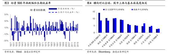 縱觀全球,股市長(zhǎng)期回報(bào)與基本面高度相關(guān)。在前期報(bào)告中,我們分析過(guò)全球股市長(zhǎng)期收益率,及其與經(jīng)濟(jì)增速之間的關(guān)系。橫向?qū)Ρ热?,各地股指年化漲幅與GDP名義年化增速表現(xiàn)出高度相關(guān),經(jīng)濟(jì)增速越高的國(guó)家股市表現(xiàn)越強(qiáng)勁。我們主要研究各國(guó)/地區(qū)同時(shí)有GDP和指數(shù)數(shù)據(jù)的最早時(shí)間至今的股市,具體如下:中國(guó)A股自1991以來(lái)股指年化漲幅為12.2%、名義GDP年化增速為14.2%(截止2018年末);中國(guó)香港自1964年來(lái)分別為10.4%、10.3%;中國(guó)臺(tái)灣自1968年來(lái)分別為9.0%、9.3%;韓國(guó)自1980年來(lái)分別為8.6%、10.5%;德國(guó)自1970年來(lái)分別為6.7%、4.7%;美國(guó)自1929年來(lái)分別為5.5%、6.1%;英國(guó)自1984年來(lái)分別為5.0%、5.3%;日本自1970年以來(lái)為4.8%、4.2%;法國(guó)自1988年來(lái)分別為2.9%、2.6%,詳見(jiàn)《牛市不需要基本面?誤會(huì)-20190321》,《投資世界長(zhǎng)期屬于樂(lè)觀者-20170710》。