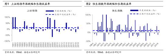 實(shí)際上,股市年漲跌幅大幅偏離長(zhǎng)期收益率。如果對(duì)比各國(guó)/各地區(qū)股市歷年漲跌幅和股指長(zhǎng)期年化漲幅,就會(huì)發(fā)現(xiàn)二者之間很少重合。如上證綜指1991年以來(lái)長(zhǎng)期年化漲幅為12.2%,而實(shí)際上從1991年以來(lái)的29年中上證綜指年漲跌幅與之接近的僅有1年,即使放寬幅度,漲幅在8%-16%之間的年份也只有2年,占比約7%。恒生指數(shù)從1964年以來(lái)長(zhǎng)期年化漲幅為10.4%,在港股56年歷史中恒生指數(shù)年漲跌幅在6%-14%之間的年度僅有3年,占比5.4%。標(biāo)普500指數(shù)從1928年以來(lái)長(zhǎng)期年化漲幅為5.5%,從1928年以來(lái)的92年中標(biāo)普500指數(shù)漲幅在1.5%-9.5%之間的僅有8年,占比8.7%。正如霍華德馬克思在《周期》中寫(xiě)過(guò):“一個(gè)擺動(dòng)的鐘擺,也許會(huì)擺到中心點(diǎn)——相當(dāng)于“平均水平”,但它在中心點(diǎn)停留的時(shí)間及其短暫,可以說(shuō)是一晃而過(guò)。股票市場(chǎng)經(jīng)常大幅偏離正常收益水平,在很大程度上要?dú)w因于投資人的心理和情緒像鐘擺一樣大幅擺動(dòng)”。