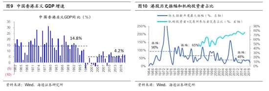 港股波動(dòng)幅度在2000年后快速降低。恒生指數(shù)年平均振幅從1980-2000年的65%降至2000年后的48%。而香港名義GDP增速在2000年后同樣明顯放緩,1962-2000年之間香港名義GDP增速為14.8%,2000年之后降至4.2%。從投資者結(jié)構(gòu)來(lái)看,從2000年以來(lái)香港機(jī)構(gòu)投資者占比大幅提升,港股個(gè)人投資者交易占比從2000年的51.5%降至2018年的16%,機(jī)構(gòu)投資者交易占比從2000年的48.5%升至2018年的84%。
