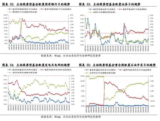 所有二級行業(yè)中,低配比例居前10的是國有銀行Ⅱ、證券Ⅱ、發(fā)電及電網(wǎng)、石油開采Ⅱ、建筑施工Ⅱ、石油化工、股份制與城商行、煤炭開采洗選、普鋼、乘用車Ⅱ,相對標準行業(yè)的配比分別為-7.36%、-2.73%、-2.37%、-2.34%、-2.15%、-1.62%、-1.48%、-1.35%、-1.06%、-0.99%。