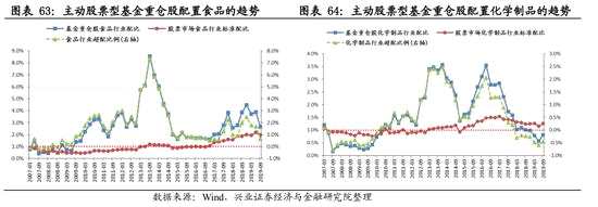超配比例前5的行業(yè)中,只有電子、醫(yī)藥在2019Q3的超配比例較前一季度有所上升。其中醫(yī)藥的超配比例位于2015年以來的較高位置,電子的超配比例接近創(chuàng)2017Q3以來的新高。食品飲料、家電、農(nóng)林牧漁的超配比例則環(huán)比有所下降,其中農(nóng)林牧漁連續(xù)2個季度下降,食品飲料和家電的超配比例則是下降后仍然處于較高的位置。