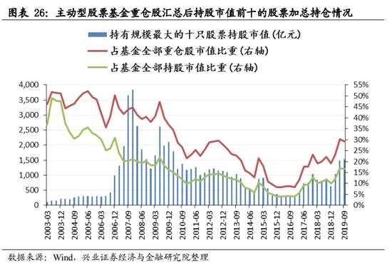 基金的持股集中度仍位于2012年以來的高位。匯總歷年全部主動股票型基金的重倉股后,進一步分析持股市值前十的股票占所有重倉股的持股比重。2019Q3這前十只股票持股市值從上季度的1484億繼續(xù)上升至1536億。不過,這前10只股票持倉市值占全部重倉股持倉市值的比重從2019Q2的30.2%下降至29.2%,下降了約1個百分點,占主動型基金的全部持股市值的比重也小幅回落至16.52%。這2個指標雖然在三季度有所回落,但仍位于2012年以來的高位。