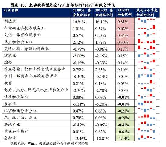 全部持倉標的中,主動型基金2019Q3加倉制造業(yè)、采礦業(yè)較多,減倉“信息傳輸、軟件和信息技術(shù)服務(wù)業(yè)”、“房地產(chǎn)業(yè)”較多