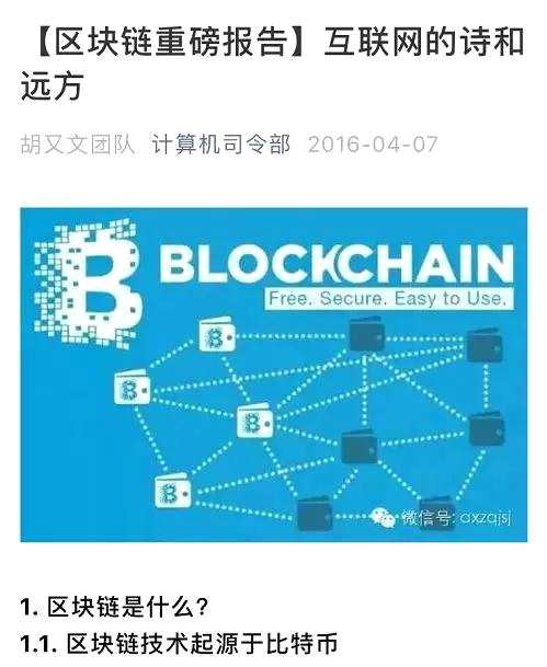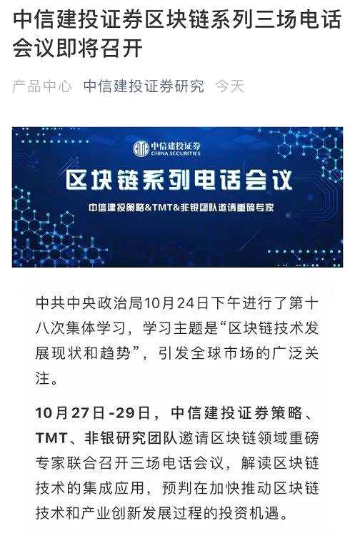 這個周末,大家都在緊急加班。券商有關區(qū)塊鏈的電話會議和各類報告此起彼伏,投資者更是群情激動,朋友圈早已各類區(qū)塊鏈學習刷屏,中信建投證券就三場區(qū)塊鏈系列電話會議。