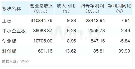 總體上看,前三季度A股上市公司合計實現(xiàn)營業(yè)總收入35.83萬億元,同比增長8.65%,實現(xiàn)凈利潤3.19萬億元,同比增長6.77%。其中主板業(yè)績穩(wěn)健增長,中小創(chuàng)凈利潤下滑明顯。