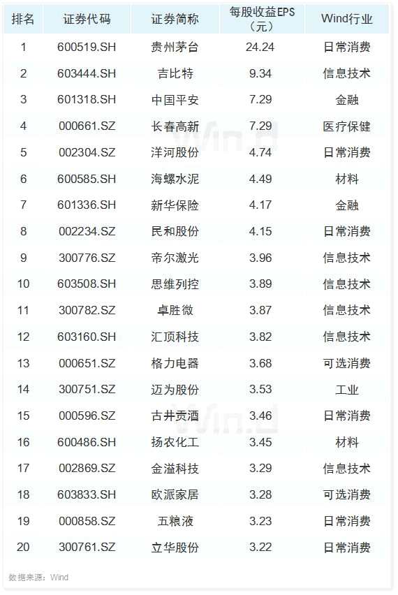 每股收益榜TOP20