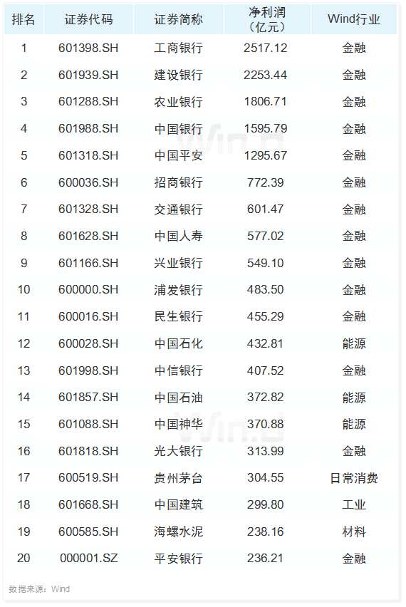 前三季度,工行、建行、農(nóng)行、中行和中國平安凈利潤均超過1000億元位居前五,且凈利潤前20名中有14家屬于金融業(yè)。
