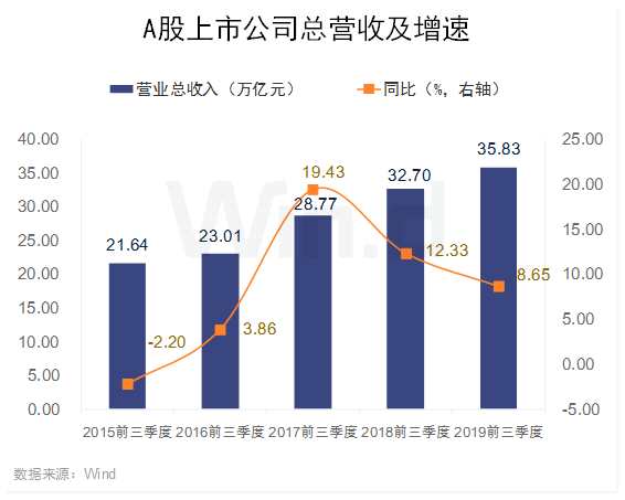 2019年前三季度A股上市公司合計實現(xiàn)營業(yè)總收入35.83萬億元,同比增長8.65%;實現(xiàn)凈利潤(備注:以下統(tǒng)計均為歸屬母公司凈利潤)3.19萬億元,同比增長6.77%。