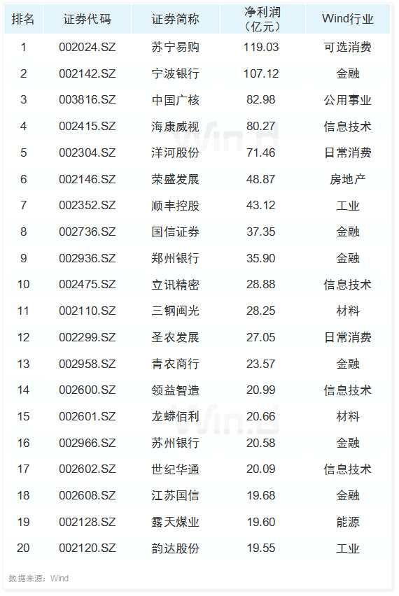 中小板盈利榜TOP20