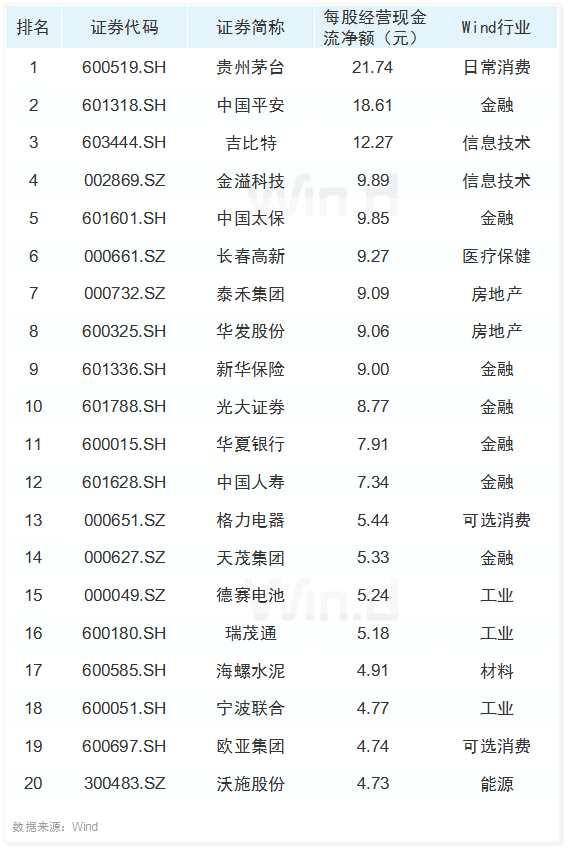 每股經(jīng)營現(xiàn)金流TOP20