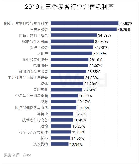 剔除金融業(yè)后,前三季度,制藥、生物科技與生命科學(xué)行業(yè)銷售毛利率達(dá)50.63%,位居首位;消費者服務(wù)行業(yè)以49.29%的毛利率位列第二。