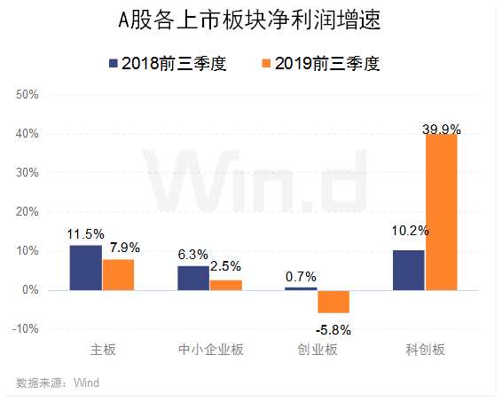 前三季度,主板業(yè)績穩(wěn)健增長,中小創(chuàng)凈利潤下滑明顯;科創(chuàng)板則成長性十足,營收和凈利潤均呈現(xiàn)兩位數(shù)的增長。