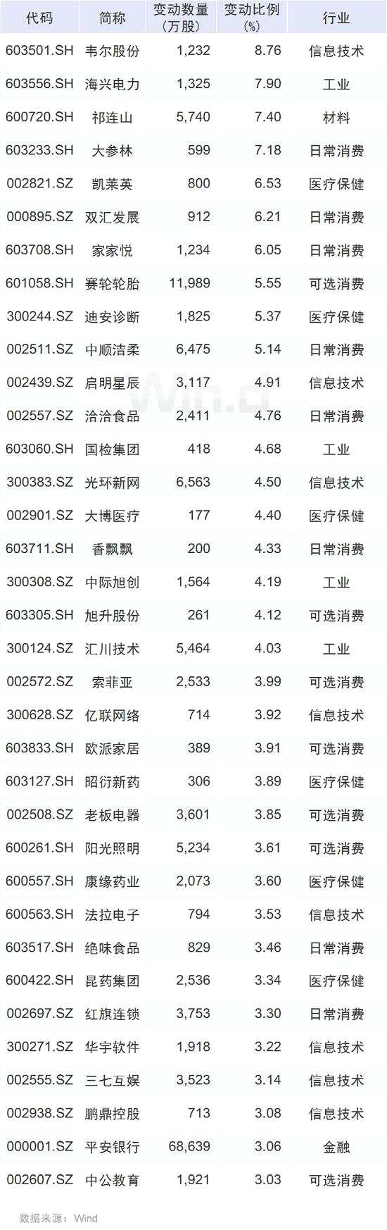 從具體公司來看,最高的為韋爾股份,變動(dòng)占流通股比例達(dá)8.76%,此外,海興電力、祁連山、大參林、【凱萊英(002821)、股吧】、雙匯發(fā)展、家家悅、賽輪輪胎、迪安診斷、中順潔柔等公司凈買入比例占流通股比變動(dòng)均超過5%。從買入比例變動(dòng)較高的公司來看,基本上是各行業(yè)龍頭。