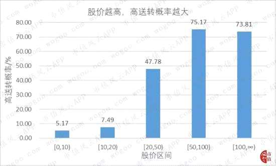 如下圖當股價處于10元以下時,發(fā)生高送轉(zhuǎn)的概率為5.2%,當股價大于100,高送轉(zhuǎn)的概率為73.81%。