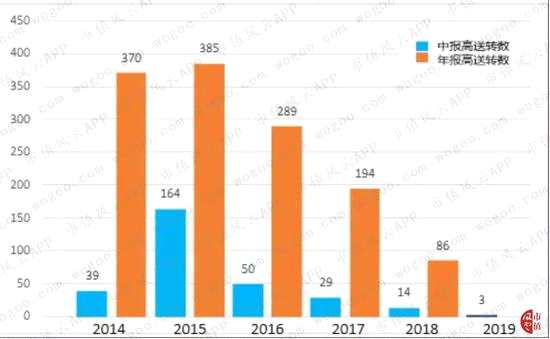 為了一夜暴富,哦,不對,為了研究高送轉(zhuǎn)事件效應(yīng),風云君統(tǒng)計了2014年-2019年間所有發(fā)布高送轉(zhuǎn)的數(shù)目,共計1623家,發(fā)現(xiàn)高送轉(zhuǎn)數(shù)量正在逐年減少。