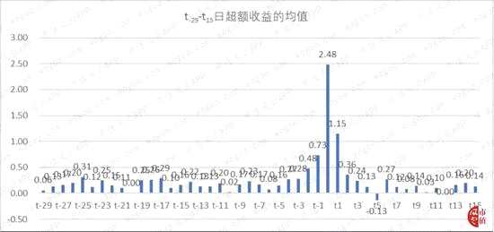 2、統(tǒng)計1623只個股t-29-t15的日超額收益率的均值及累計收益率