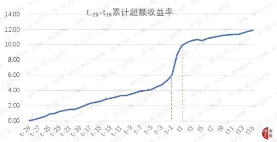 我們做了統(tǒng)計研究,研究樣本為上述1623家發(fā)布高送轉(zhuǎn)的公司,時間軸為預(yù)案日t0的前29個交易日t-29到后15個交易日t15?;鶞蔬x取上證指數(shù)。