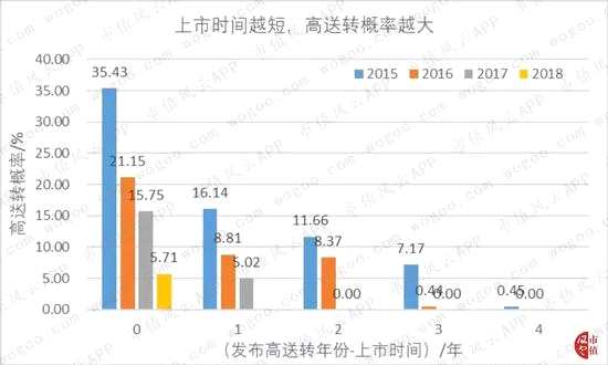 如下圖藍色柱表示在所有2015年上市的公司中,在0時刻(既上市當年)有35.4%的公司進行了高送轉(zhuǎn),上市第二年進行高送轉(zhuǎn)的比例為16.1%,第三年為11.7%,比例呈逐年下降的趨勢。