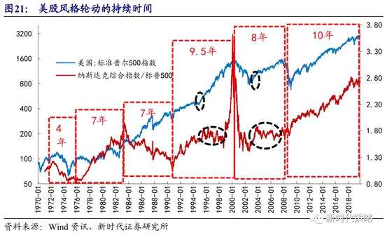 從美股的經(jīng)驗(yàn)來看,一般一次風(fēng)格大多持續(xù)7-10年時(shí)間,期間有可能會(huì)出現(xiàn)比較長時(shí)間的風(fēng)格休整,但如果要逆轉(zhuǎn)一次風(fēng)格,需要的時(shí)間往往會(huì)比較長,這和A股歷史上的風(fēng)格規(guī)律也是一致的。