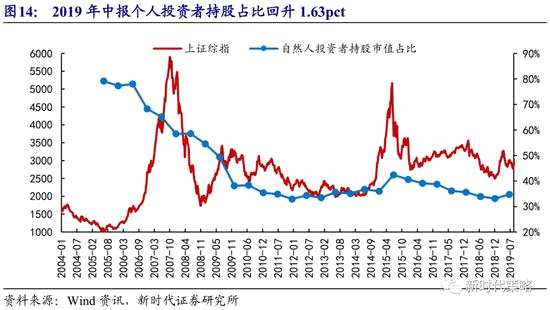關(guān)于2020年的增量資金,我們認(rèn)為有很大概率會(huì)出現(xiàn),而且不只是海外、保險(xiǎn)等機(jī)構(gòu)的資金,還有可能會(huì)有個(gè)人投資者的入場(chǎng)。影響個(gè)人投資者入場(chǎng)的因素主要有三個(gè):利率環(huán)境、股市政策、賺錢效應(yīng),基于這三點(diǎn),我們2019年6月做過一次預(yù)測(cè),認(rèn)為始于2015年的個(gè)人投資者離場(chǎng)過程已經(jīng)基本結(jié)束,這一點(diǎn)已經(jīng)兌現(xiàn)(見圖14,詳見2019年6月的報(bào)告《個(gè)人投資者離場(chǎng)基本結(jié)束》)。進(jìn)一步展望2020年,基于對(duì)三個(gè)要素的判斷(貨幣政策不會(huì)太緊、股市政策非常友好、賺錢效應(yīng)改善的時(shí)間已經(jīng)接近1年),我們認(rèn)為2020年大概率會(huì)有個(gè)人集中投資者入場(chǎng),速度可能沒有2012-2015年那么快,但是方向是比較確定的。