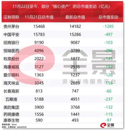 11月22日至今,僅貴州茅臺(tái)的總市值便蒸發(fā)已超過1285億元,而“核心資產(chǎn)”的市值蒸發(fā)合計(jì)更是超過4000億元。