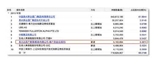 復(fù)盤2013年以來,貴州茅臺(tái)每個(gè)季度披露的前十大流通股股東數(shù)據(jù),會(huì)發(fā)現(xiàn)一個(gè)神秘席位:易方達(dá)資產(chǎn)管理(香港)有限公司,股東性質(zhì)為境外機(jī)構(gòu)投資者(QFII)。