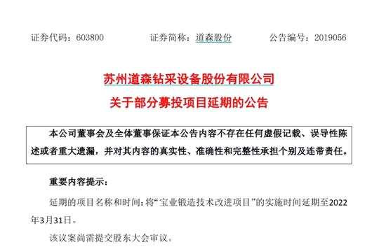 例如,【道森股份(603800)、股吧】12月18日公告,將募投項目“寶業(yè)鍛造技術改進項目”的實施時間延期至2022年3月31日。