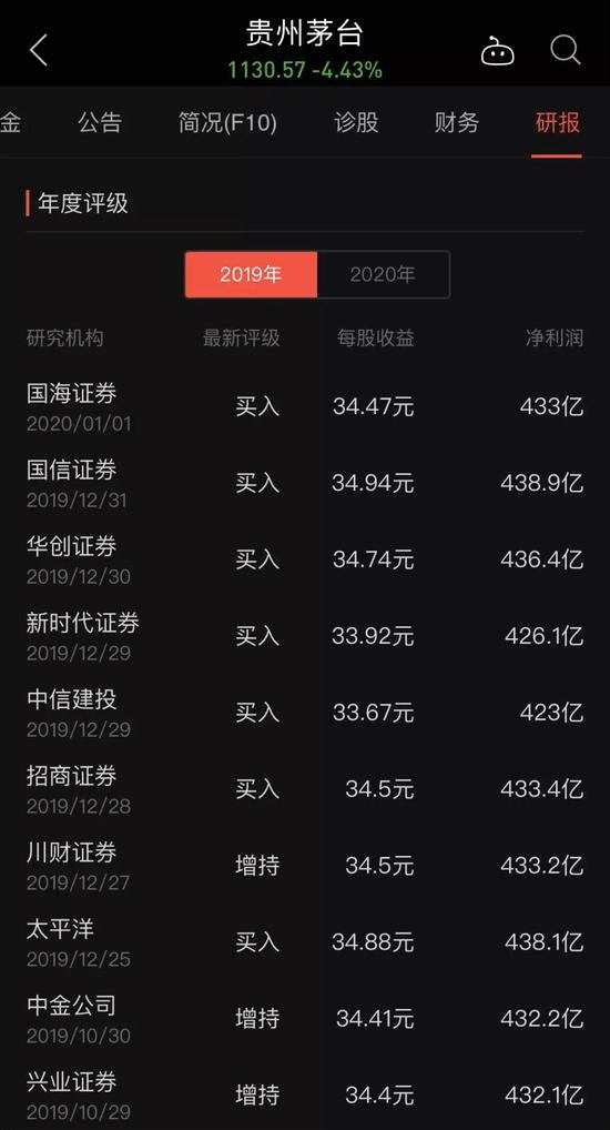 在券商的研報中,國信證券預計貴州茅臺2019年全年凈利潤438.9億元,華創(chuàng)證券預計為436.4億元,【國海證券(000750)、股吧】預計為433億元,中金公司為432.2億元。