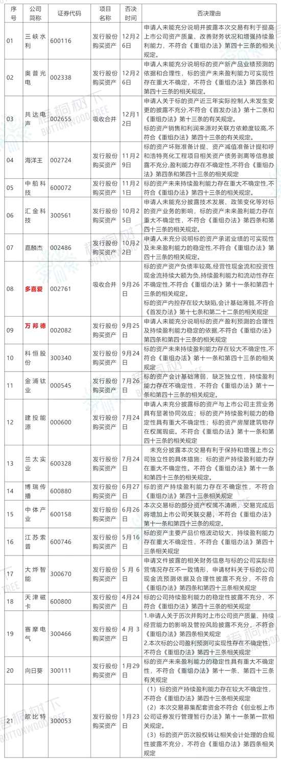 21單中,多喜愛、共達電聲吸收合并都是借殼上市,根據借殼上市的規(guī)則,重組委要參照IPO管理辦法來審核,因此,這兩項目被否的審核意見,都引用了《首發(fā)辦法》的條款。共達電聲吸收合并項目12月12日被否,原因兩個,一是共達電聲關于標的資產萬魔聲學科技近三年實際控制人未發(fā)生變更的披露不充分,不符合《首發(fā)辦法》第十二條和《重組辦法》第十三條的有關規(guī)定。二是標的資產銷售和利潤來源對關聯(lián)方依賴度較高,不符合《重組辦法》第四十三條的有關規(guī)定。多喜愛9月26日被否,原因也是兩個,一是標的資產浙江省建設投資集團資產負債率較高,經營性現(xiàn)金流和投資性現(xiàn)金流持續(xù)大額為負,持續(xù)盈利能力和流動性存在不確定性,不符合《重組辦法》第十一條和第四十三條的相關規(guī)定;二是標的資產內控存在較大缺陷,會計基礎薄弱,不符合《首發(fā)辦法》第十七條和第二十二條的相關規(guī)定。