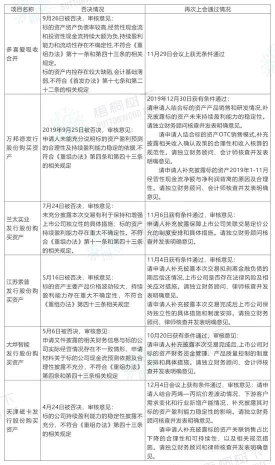 2019年,有6個項目是先被否決,“二進宮”后又獲得通過,這6個項目是:多喜愛吸收合并項目、萬邦德新材、天津磁卡、蘭太實業(yè)、江蘇索普、大燁智能等5家公司發(fā)行股份購買資產項目。