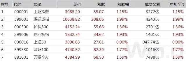 1月2日,滬深兩市高開高走大幅拉升,截至收盤,上證綜指漲1.15%報收于3085.20點;深成指漲1.99%報收于10638.82點;創(chuàng)業(yè)板指漲1.93%報收于1832.74點,兩市共3392只個股上漲,僅282只個股下跌。
